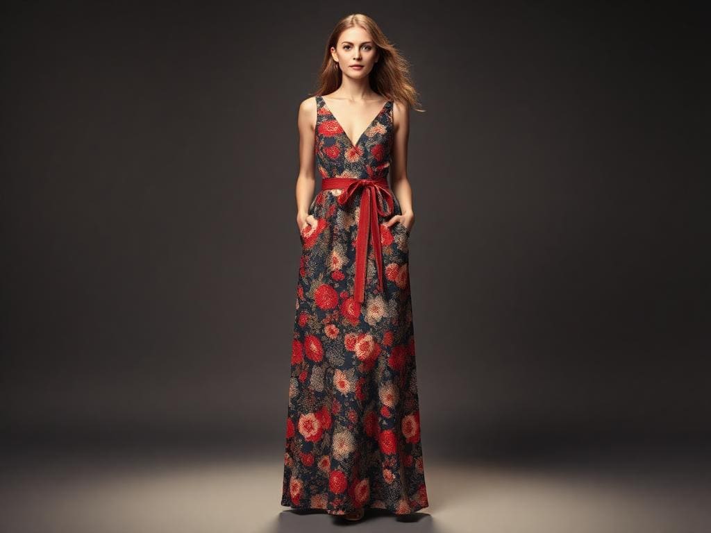 Beli kuşaklı tasarımıyla vücut hatlarını vurgulayan uzun, zarif elbise.