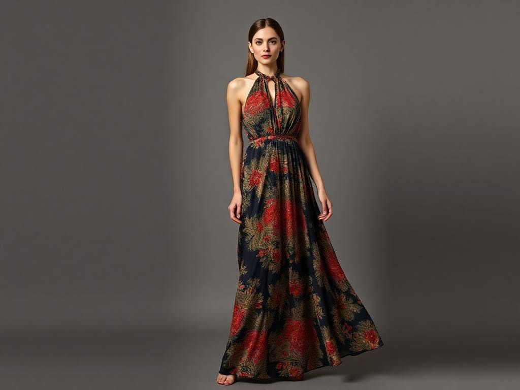 Halter yaka detayı ile cesur bir şıklık, uzun formuyla zarif bir siluet yaratır.